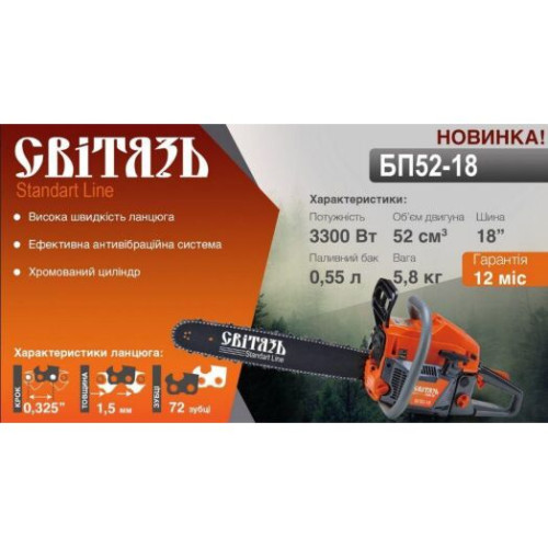 Цепная бензопила СВИТЯЗЬ БП 52-18 3,3 кВт, 1 шина, 1 цепь (9211)
