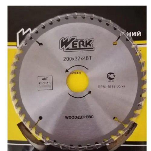 Пильный диск по дереву WERK (36112) 200*32 48 зубов - диск с твердосплавной напайкой для поперечных и продольных резов, а также качественного распила мягкой и твердой древесины, фанеры, древесины с покрытием, панелей. Диск может использоваться на любой настольной дисковой пиле даже в бытовых условиях/